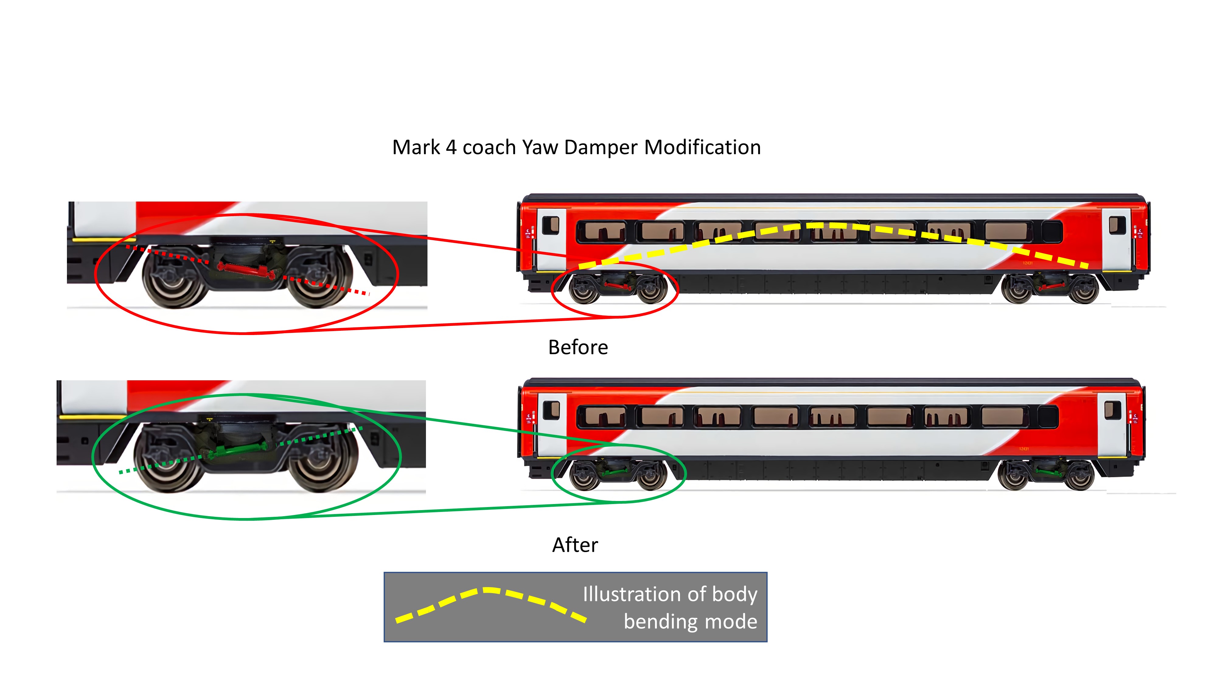 Second, it was found that the yaw dampers mounted on both sides of the bogies were exciting the first vertical body bending mode. This is illustrated in the diagram showing the original orientation of the dampers as a red line and the body bending represented by the yellow dotted line.