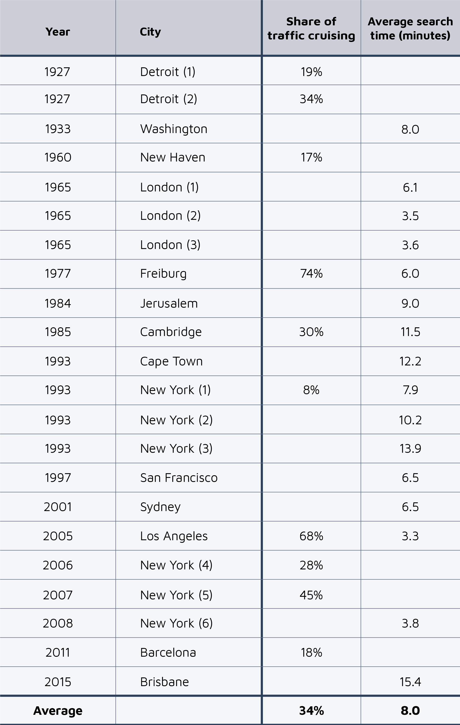 How much traffic stems from cruising for parking? Table 1 summarizes the results of 22 studies of cruising in 15 cities on four continents, dating back to 1927. According to these findings, cruising for parking accounted for between 8 and 74 percent of traffic in the areas studied, and the average time to find a curb space ranged between 3.5 and 15.4 minutes. On average, 34 percent of cars were cruising, and the average time it took to find a space was eight minutes. However, these results do not represent all city streets because researchers tend to study cruising only where they expect to find it: on downtown streets where traffic is congested and all the curb spaces are occupied. Despite this selection bias, these studies do show that searching for curb parking has wasted time and fuel for decades.