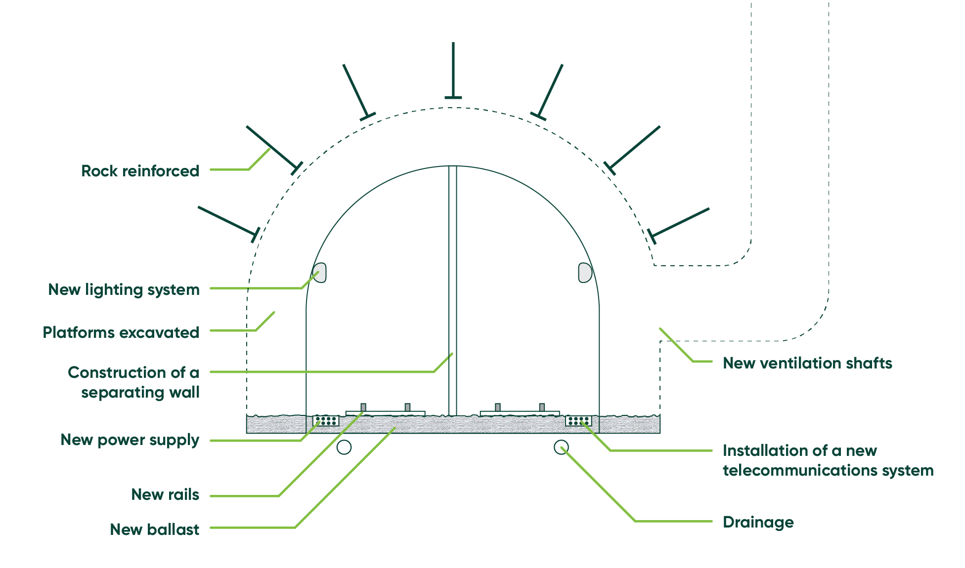 In 2021 excavation began along each tunnel track to create niches in which anchors were installed for the installation of the auxiliary systems and equipment. Simultaneously, installation began of the 1,300 prefabricated concrete barrier components to build the central fire wall down the length of the tunnel. This ensures that a fire in one tunnel or train does not affect the other tunnel.