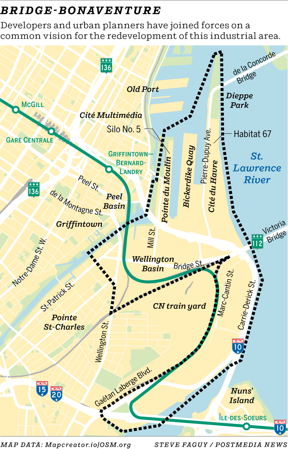 In 2022, the previous Mayor Valérie Plante requested that another infill REM station, Bridge-Bonaventure, be constructed south of Lachine Canal. This would assist in the redevelopment of the port and industrial lands into a densely populated area with large residential towers. The REM station would be located off Bridge Street, south of the 'B' of 'Wellington Basin' in the map below: