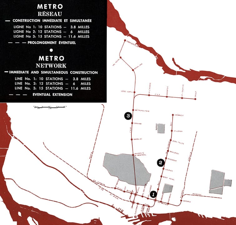 The original plan for the modern Métro network was presented to the public in October 1961, consisting of three lines: Line 1 (Green) running east-west, Line 2 (Orange) running north-south in a large U shape, and Line 3 (Red) running under Mont-Royal, taking over the Deux-Montagnes commuter railway tunnel and alignment.